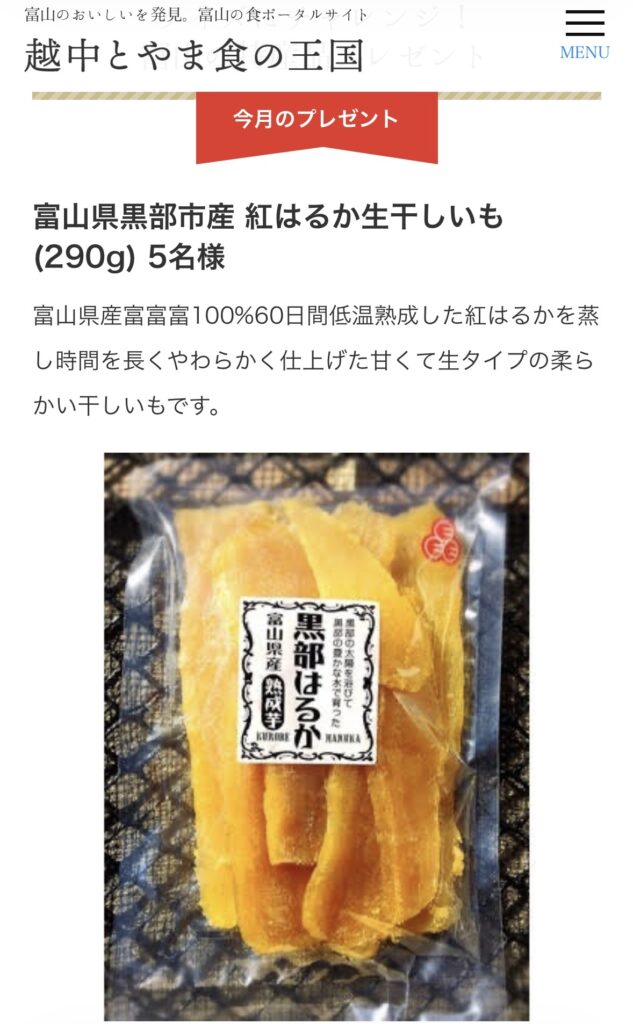 富山県産の紅はるかの生干しいもが当たりますね!