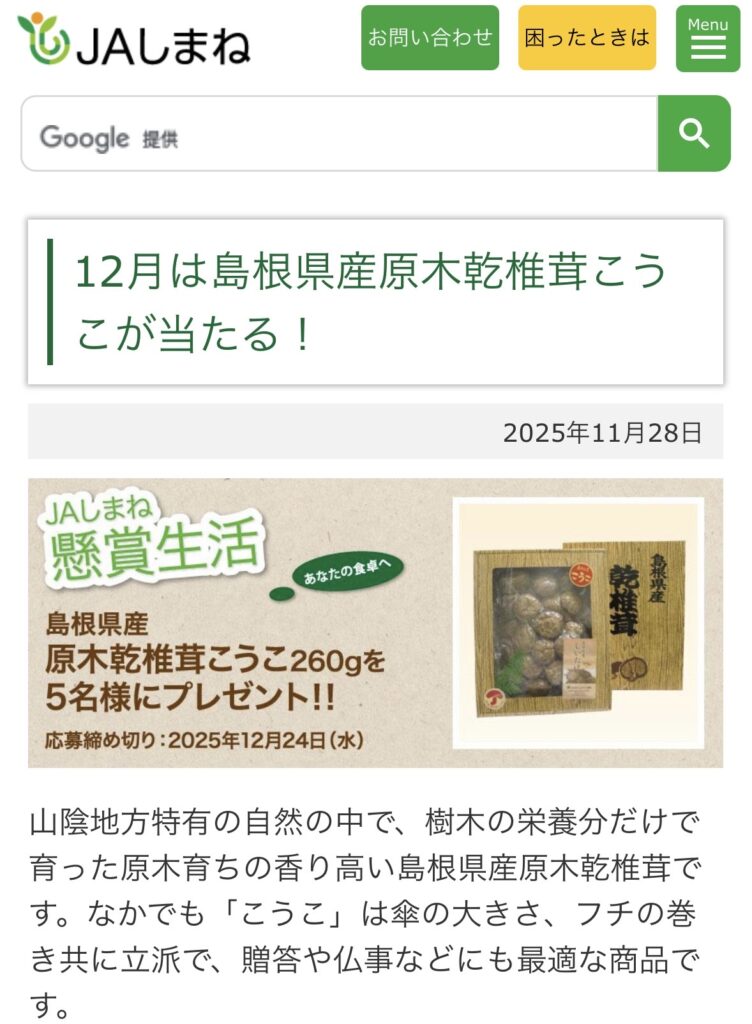 画像出展:JAしまね 原木乾椎茸こうこ260gプレゼントキャンペーン