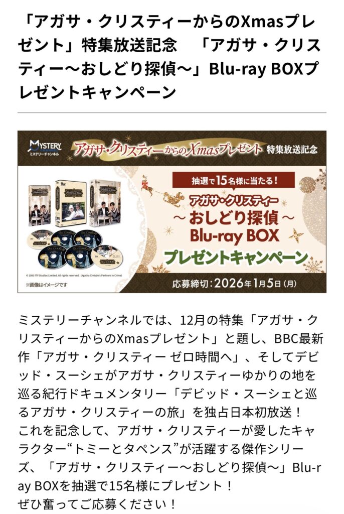 ●ミステリーチャンネル アガサ・クリスティー おしどり探偵 Blu-ray BOXプレゼントキャンペーン