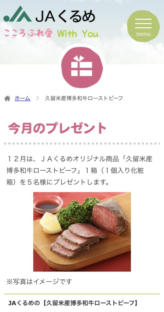 画像出展:JAくるめ 久留米産博多和牛ローストビーフプレゼントキャンペーン