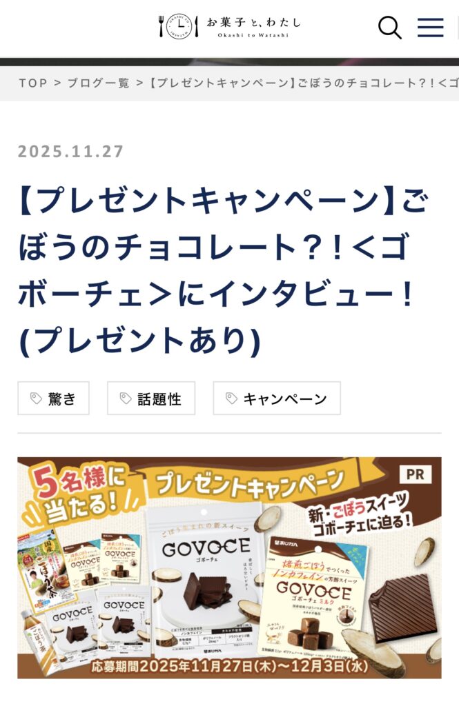 ●お菓子と、わたし ごぼうチョコプレゼントキャンペーン